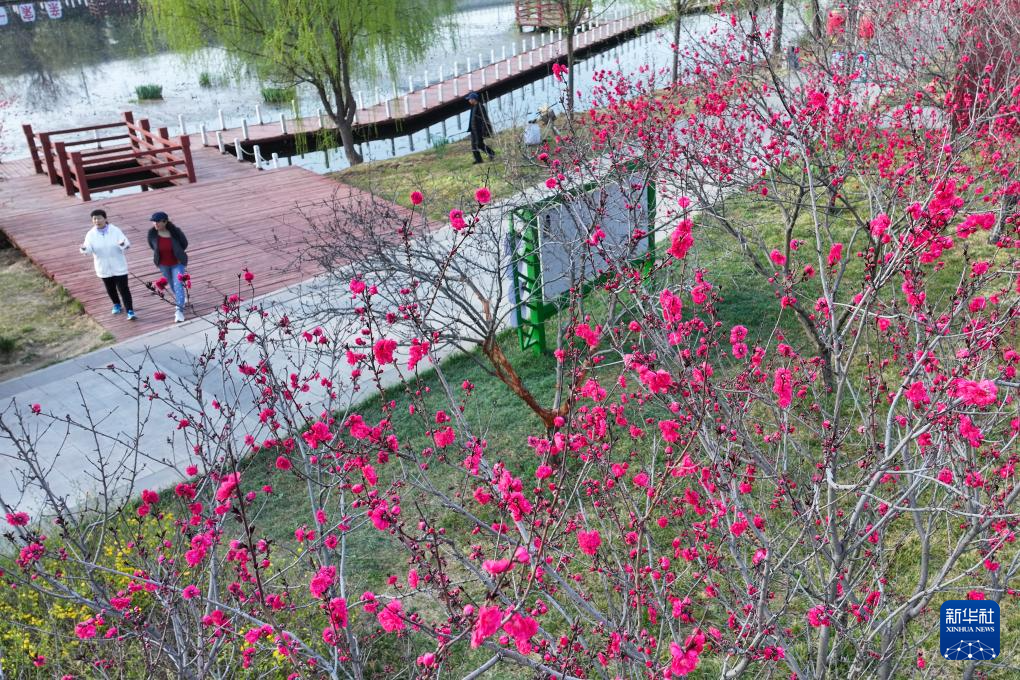4月8日,市民在河北省唐山市丰南区人民公园赏景游玩(无人机照片)。
