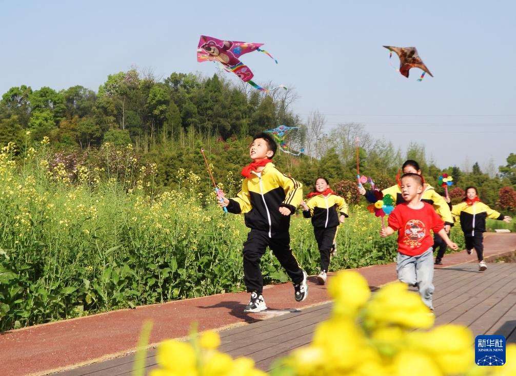 4月8日,学生在四川省达州市大竹县月华镇河心村油菜花田里放风筝。