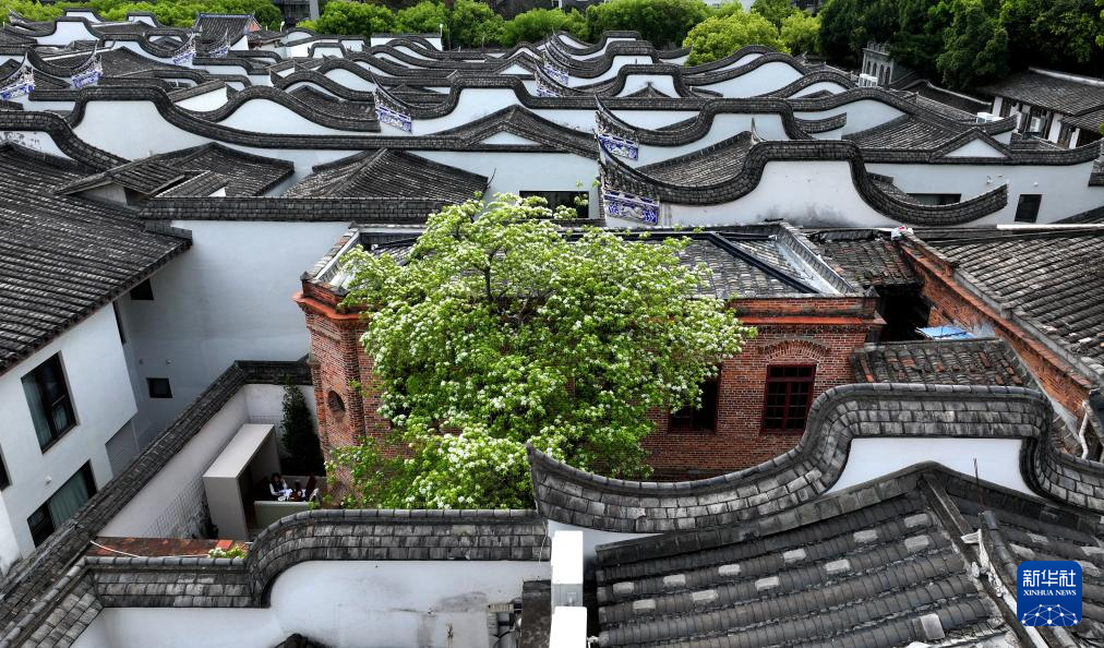 4月7日在福建福州三坊七巷衣锦坊拍摄的流苏花(无人机照片)。