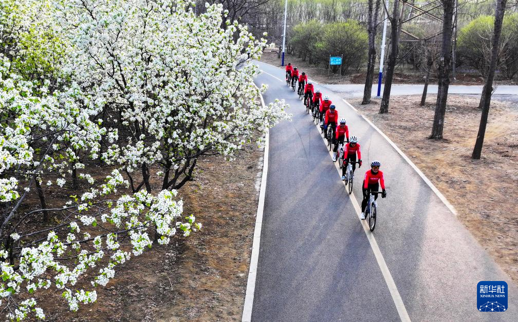 4月7日,骑行爱好者在河北省遵化市一公园晨练(无人机照片)。