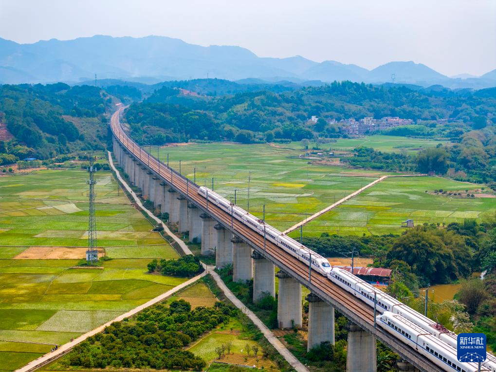 4月8日,动车组在广西梧州市龙圩区龙圩镇念村境内行驶(无人机照片)。