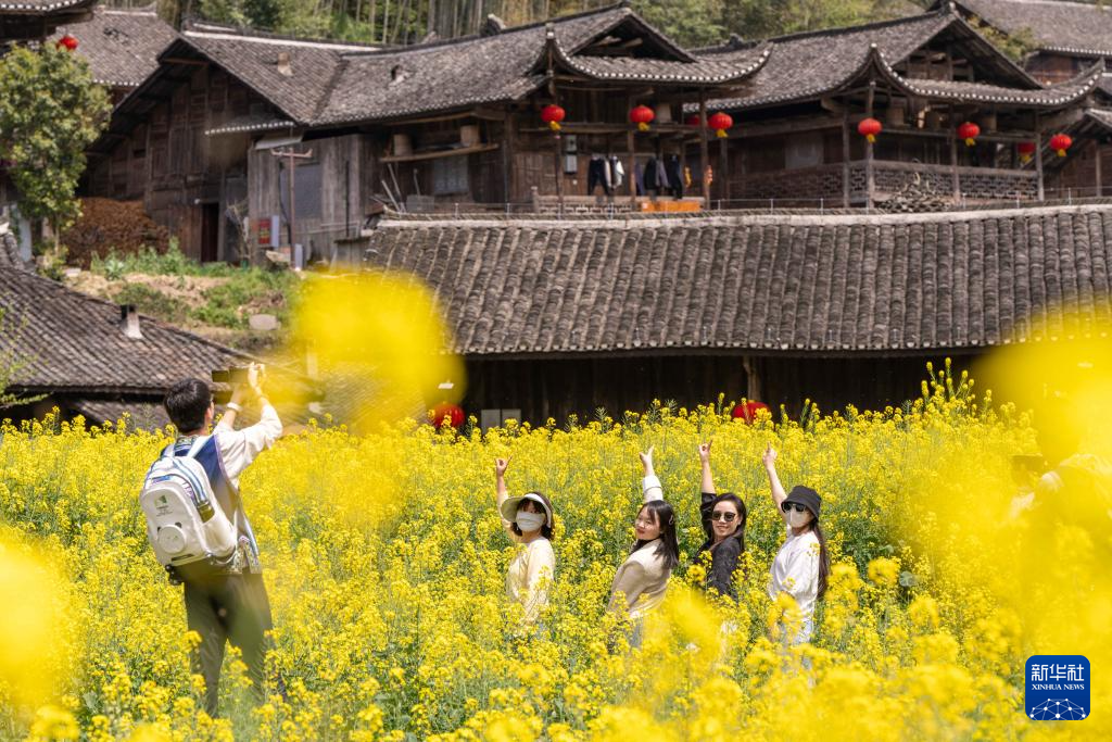 4月8日,游客在湖北省宣恩县彭家寨吊脚楼前赏花游玩。
