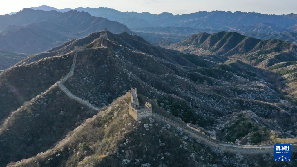 这是4月8日在河北省承德市滦平县拍摄的金山岭长城春色(无人机照片)。