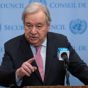 4月8日,在位于纽约的联合国总部,联合国秘书长古特雷斯出席记者会。