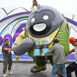 4月10日,工作人员在摆放消博会吉祥物。