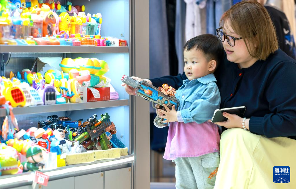 4月10日,小朋友在黑龙江省大兴安岭地区一家超市选购商品。