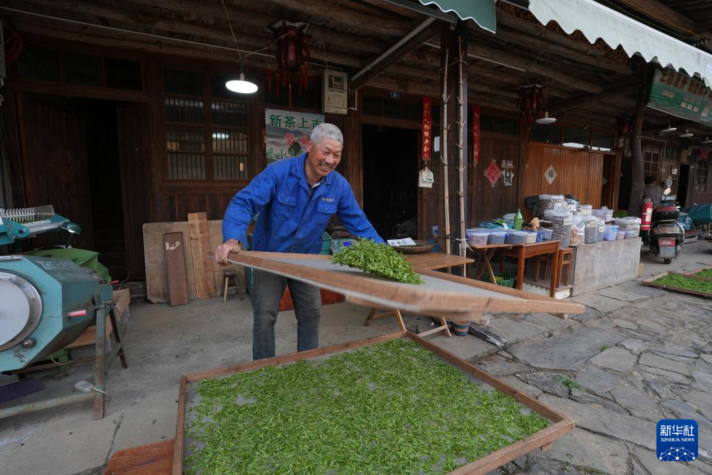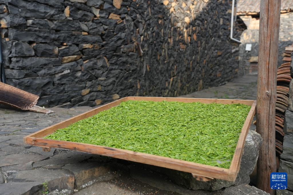 这是在磐安县尖山镇乌石村古民居间晾晒的茶青(4月10日摄)。