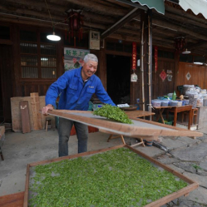4月10日,在磐安县尖山镇乌石村,村民在翻动茶青。