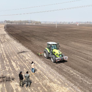 4月11日,在内蒙古兴安盟科右中旗巴彦呼舒镇浩特化嘎查一处农田,乡镇干部在为“村闻联播”拍摄素材(无人机照片)。