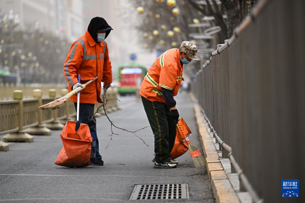 4月11日,在呼和浩特市街头,环卫工人清理被风刮断的树枝。