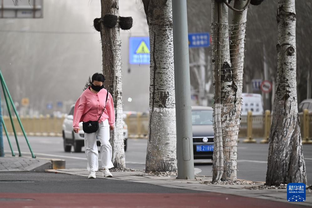 4月11日,在呼和浩特市街头,市民在大风天气下出行。