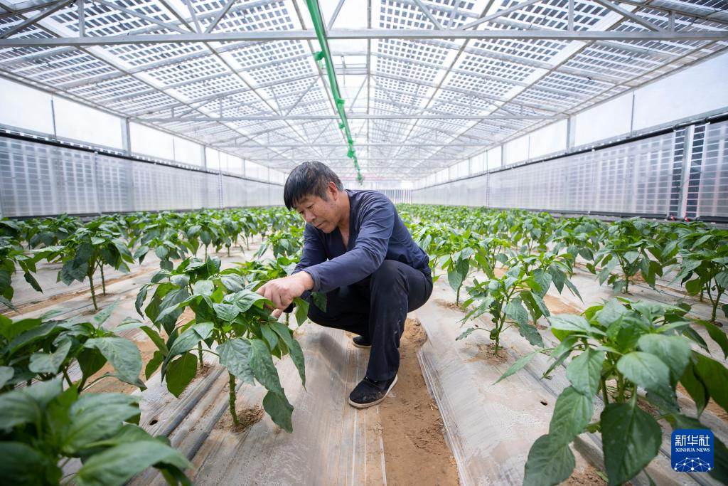 4月10日,当地农户在宁夏吴忠市红寺堡区柳泉乡永新村高效智能恒温节水光伏大棚内打理彩椒。