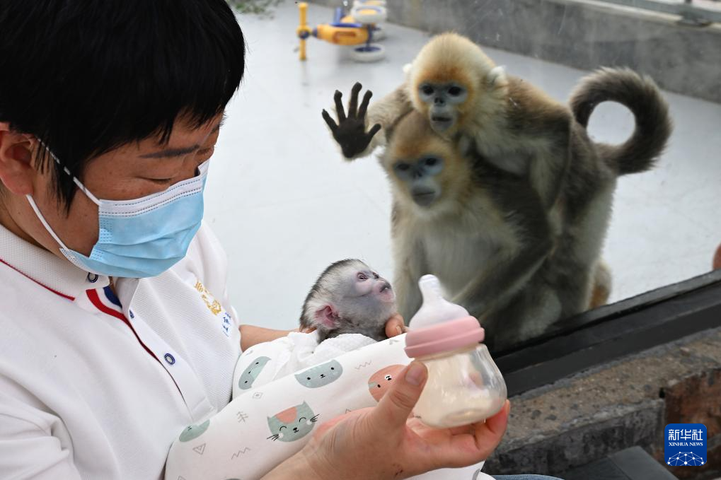4月8日,工作人员在河南省商丘动物园给川金丝猴幼崽喂奶。
