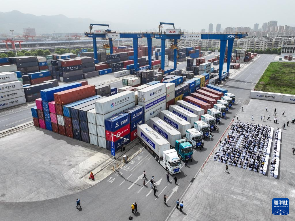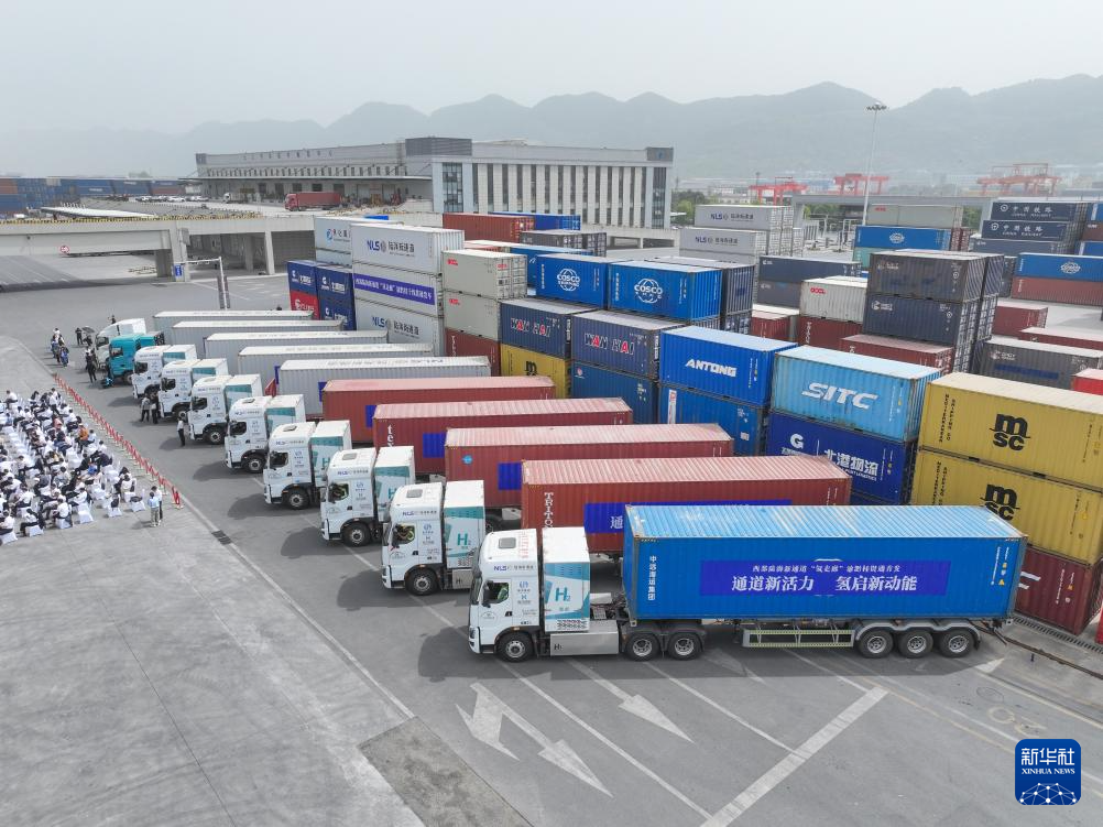 4月14日,氢能重卡在陆海新通道重庆无水港顺利发车(无人机照片)。