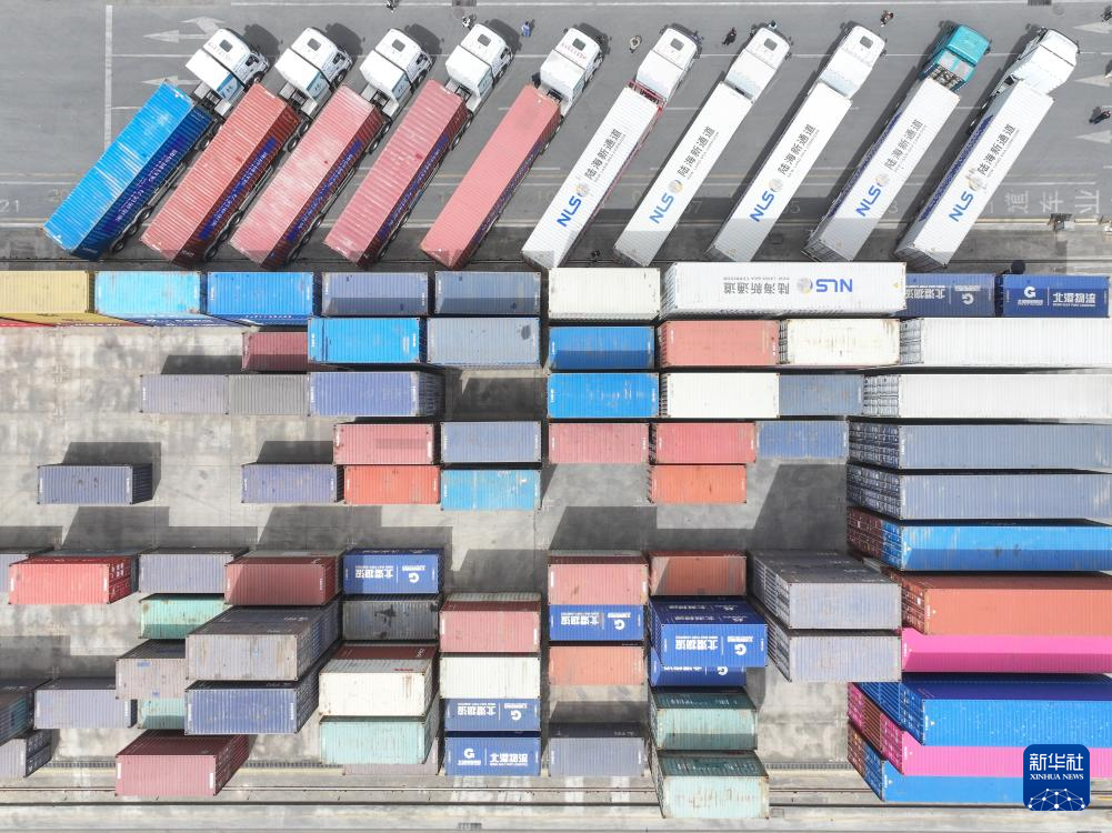 4月14日,氢能重卡在陆海新通道重庆无水港等候发车(无人机照片)。