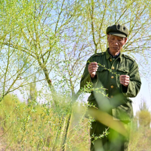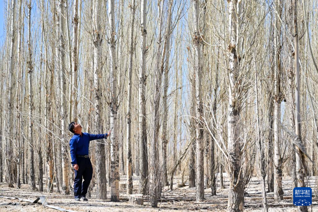 在新疆巴音郭楞蒙古自治州和静县付志周防沙治沙造林区,付国喜在父亲付志周建设的林带查看树木生长情况(4月11日摄)。40多年来,付志周在沙漠种植了约3000亩、超过80万棵树。2024年付志周去世后,儿子付国喜接过了植树造林的接力棒。