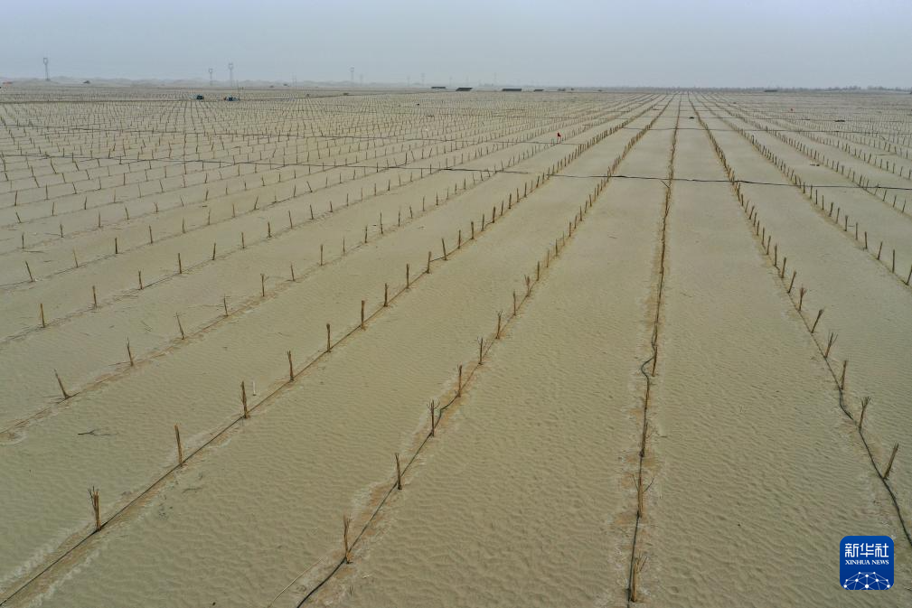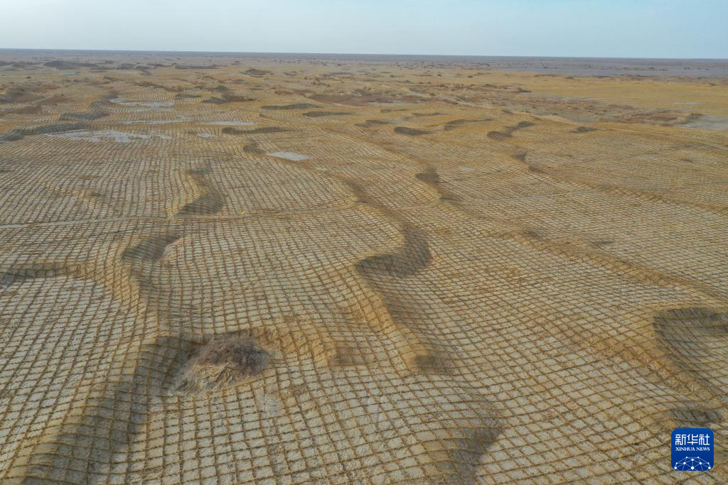 这是在新疆和田地区民丰县后河坝“工程治沙+生物治沙”叠加治理区拍摄的芦苇方格沙障(4月8日摄,无人机照片)。