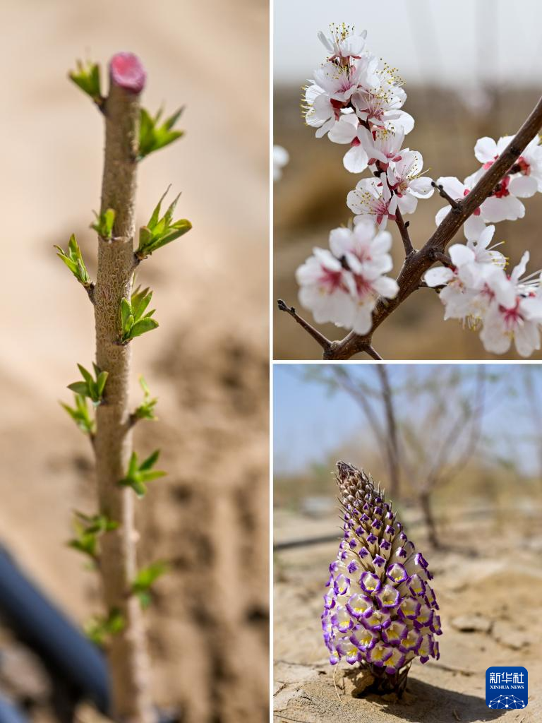 拼版照片:左图为新疆和田地区于田县阿热勒七仙女防沙治沙标杆项目区种植的玫瑰花苗(4月8日摄);右上为新疆阿克苏地区拜城县万亩吊干杏种植基地内杏花绽放(4月12日摄);右下为新疆和田地区于田县阗东防沙治沙综合示范标杆区生长的肉苁蓉(4月8日摄)。