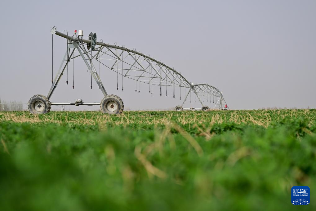 新疆阿克苏地区沙雅县沙生经济作物发展试验基地,经过苦咸水淡化技术处理的地下水喷灌出的小麦长势良好(4月13日摄)。