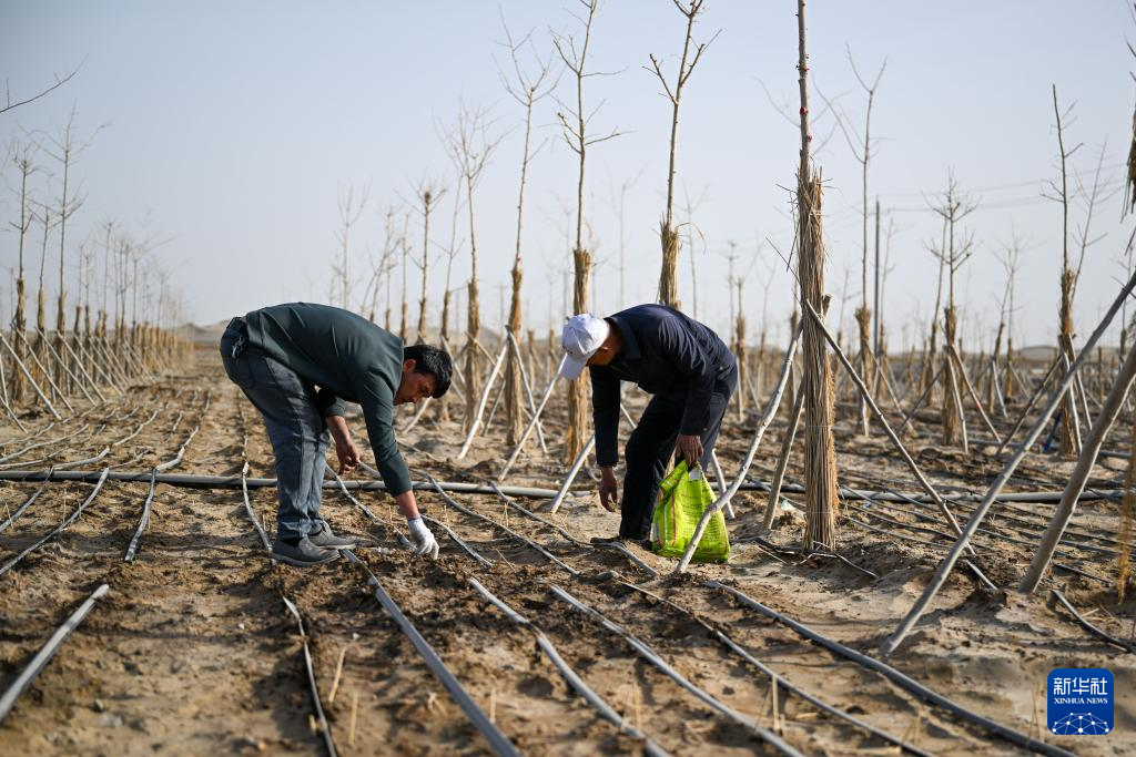在新疆和田地区于田县沙产业实验基地,当地群众在整理滴灌带(4月8日摄)。