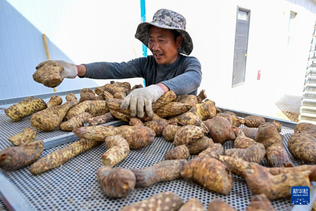 在新疆巴音郭楞蒙古自治州且末县万亩有机肉苁蓉种植基地,工作人员将分拣好的肉苁蓉晾晒(4月9日摄)。