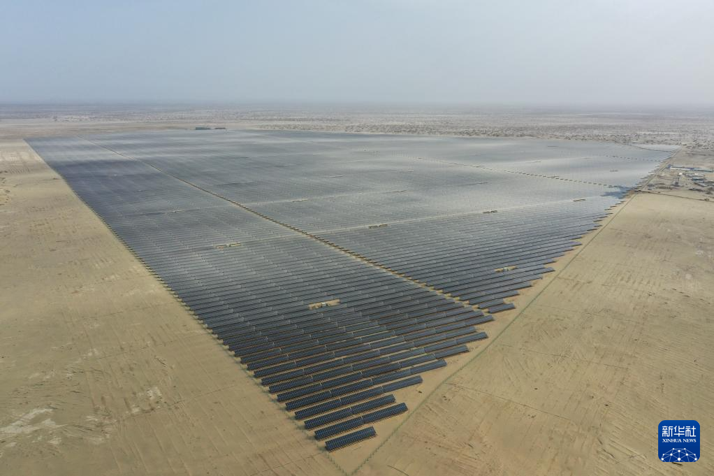 这是在新疆阿克苏地区沙雅县拍摄的25万千瓦光伏产业园区低碳转型新能源项目(4月13日摄,无人机照片)。近年来,沙雅县采取光伏治沙、生物治沙等措施,为当地构建起一道绿色屏障。