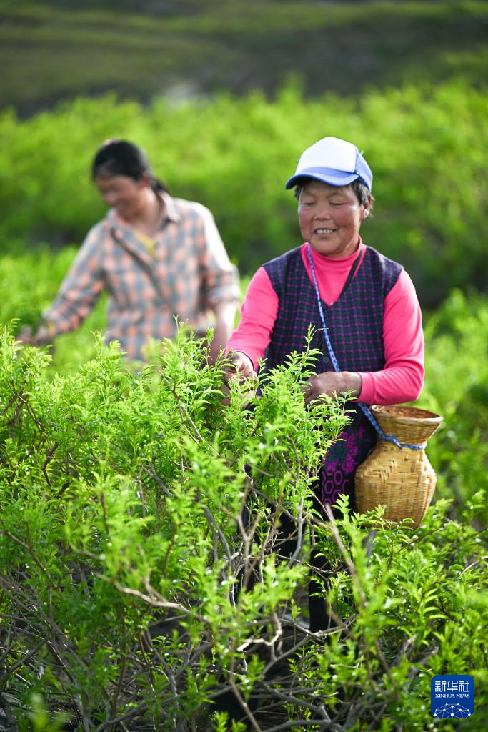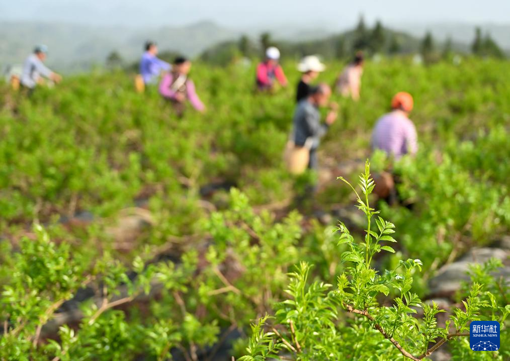 4月14日,在湖北省来凤县革勒车镇桑树坪村藤茶基地,茶农在采摘藤茶鲜叶。