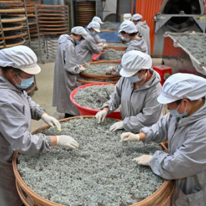 4月14日,在湖北省来凤县翔凤镇一家藤茶公司生产车间,工人在筛选藤茶。