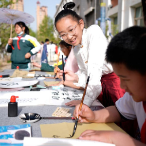 4月17日,兴庆区实验第二小学学生在活动上体验书法写作。
