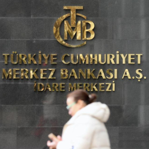 4月17日,在土耳其首都安卡拉,一名女子经过土耳其中央银行的标识。