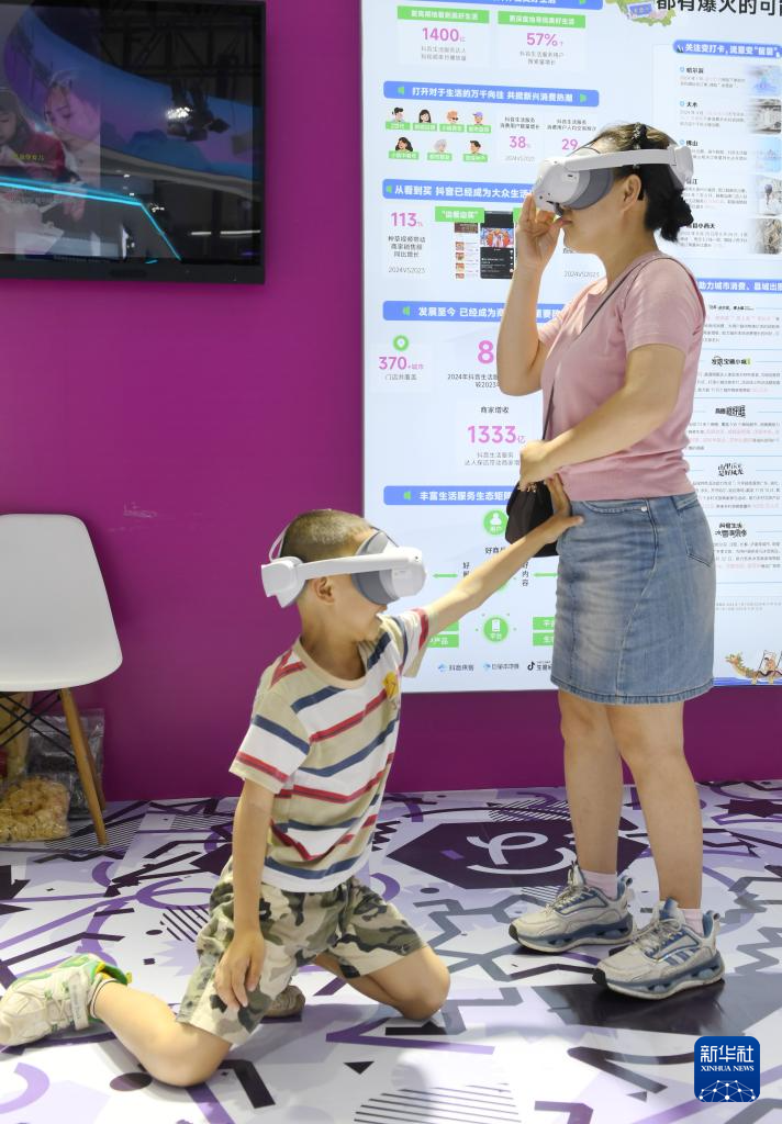 4月18日,一对母子在第五届消博会北京展台尝试虚拟现实互动体验。