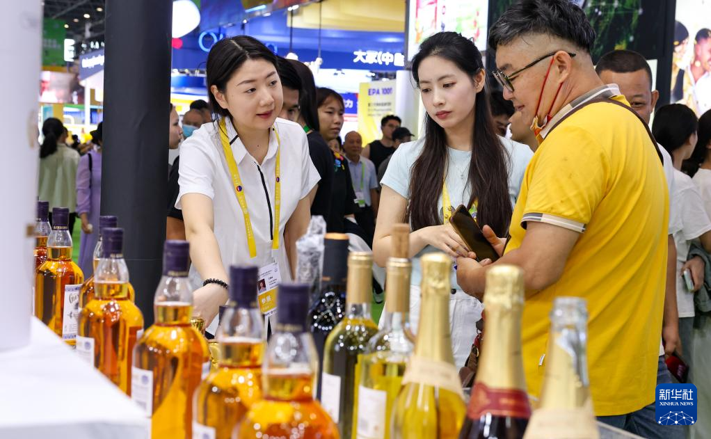 4月18日,观众在第五届消博会高端食品保健品展区参观。