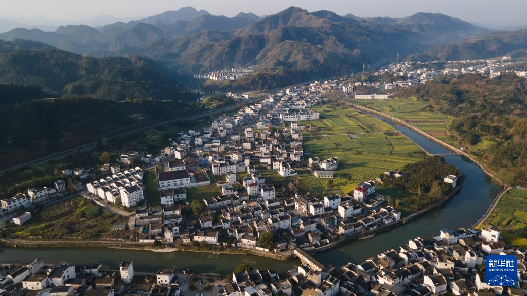 这是2025年3月24日在安徽省黄山市歙县拍摄的北岸廊桥和周边风景(无人机照片,画面下方为北岸廊桥)。