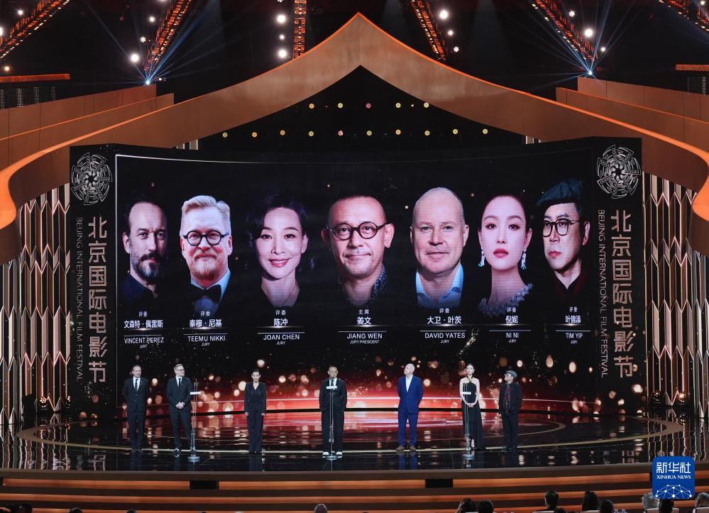 4月18日,本届北京国际电影节“天坛奖”国际评奖委员会成员文森特·佩雷斯(左一)、泰穆·尼基(左二)、陈冲(左三)、姜文(中)、大卫·叶茨(右三)、倪妮(右二)和叶锦添亮相开幕式。