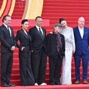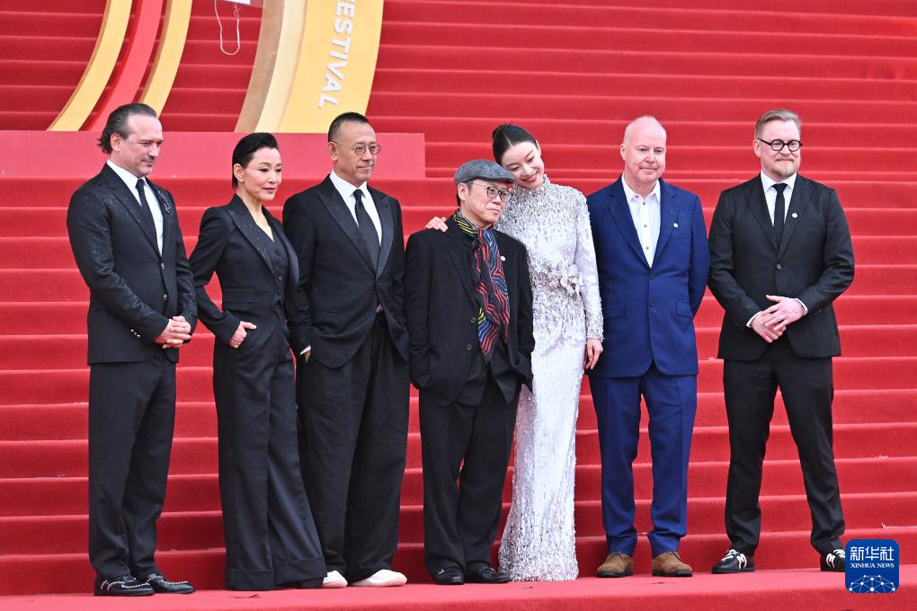 4月18日,第十五届“天坛奖”国际评奖委员会成员文森特·佩雷斯(左一)、陈冲(左二)、姜文(左三)、叶锦添(中)、倪妮(右三)、大卫·叶茨(右二)和泰穆·尼基亮相红毯。