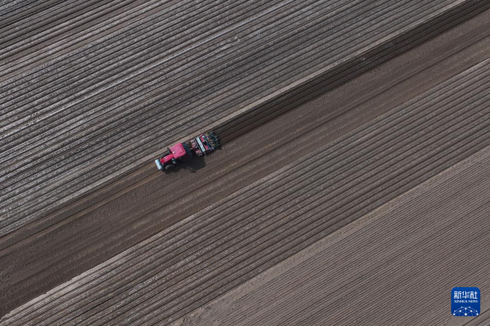 4月17日,河北省滦州市滦城街道陈庄村的农民在田间使用农机播种花生(无人机照片)。