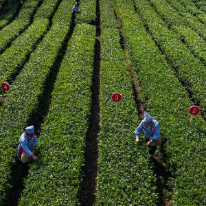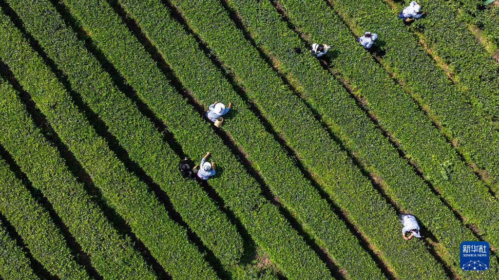 4月18日,选手在重庆市永川区何埂镇石笋山茶园采茶(无人机照片)。