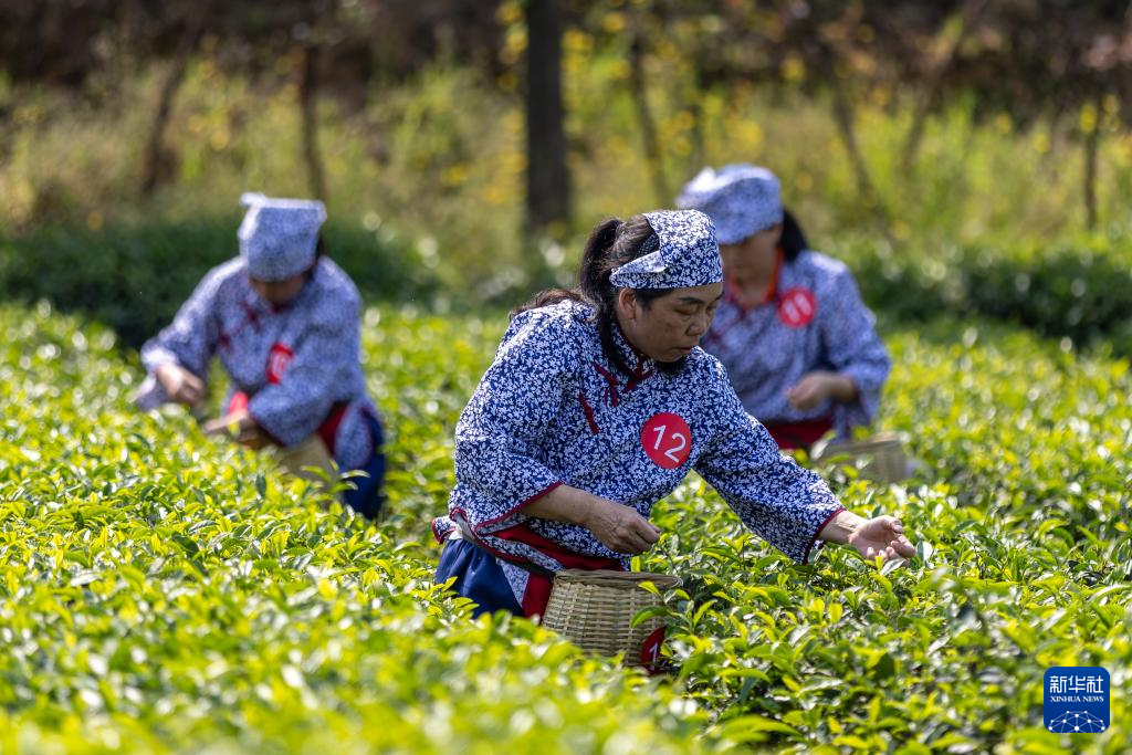 4月18日,选手在重庆市永川区何埂镇石笋山茶园采茶。