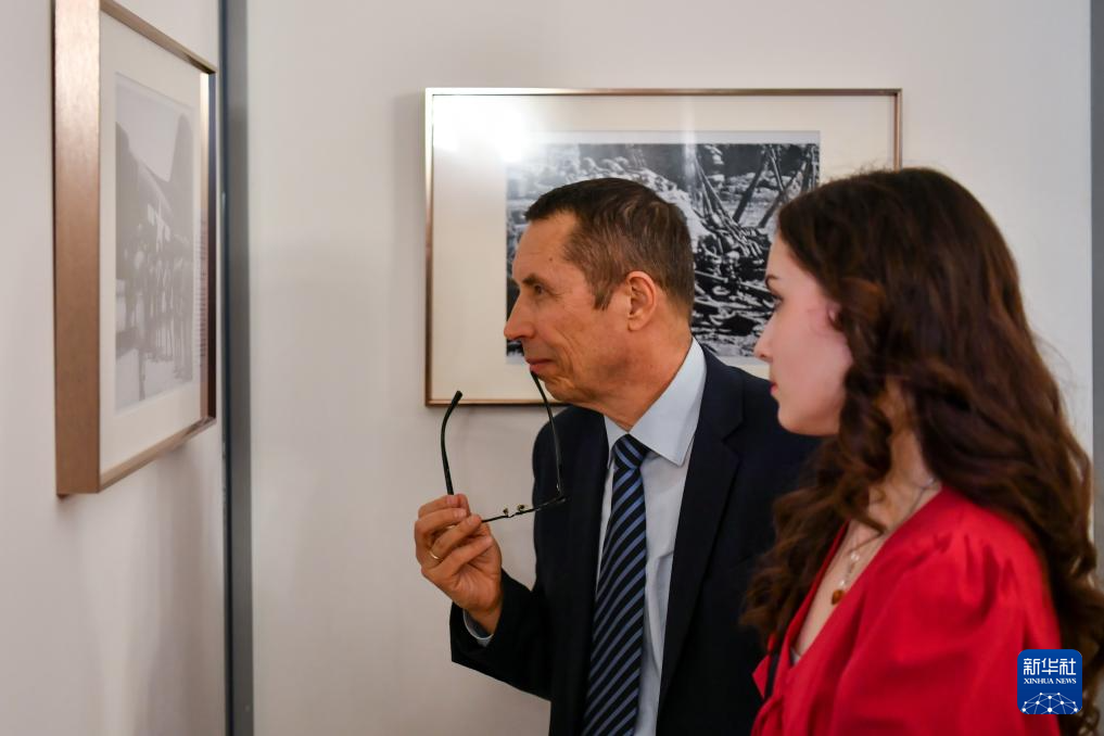 4月18日,在俄罗斯首都莫斯科,嘉宾参观纪念中国人民抗日战争暨世界反法西斯战争胜利80周年图片展。
