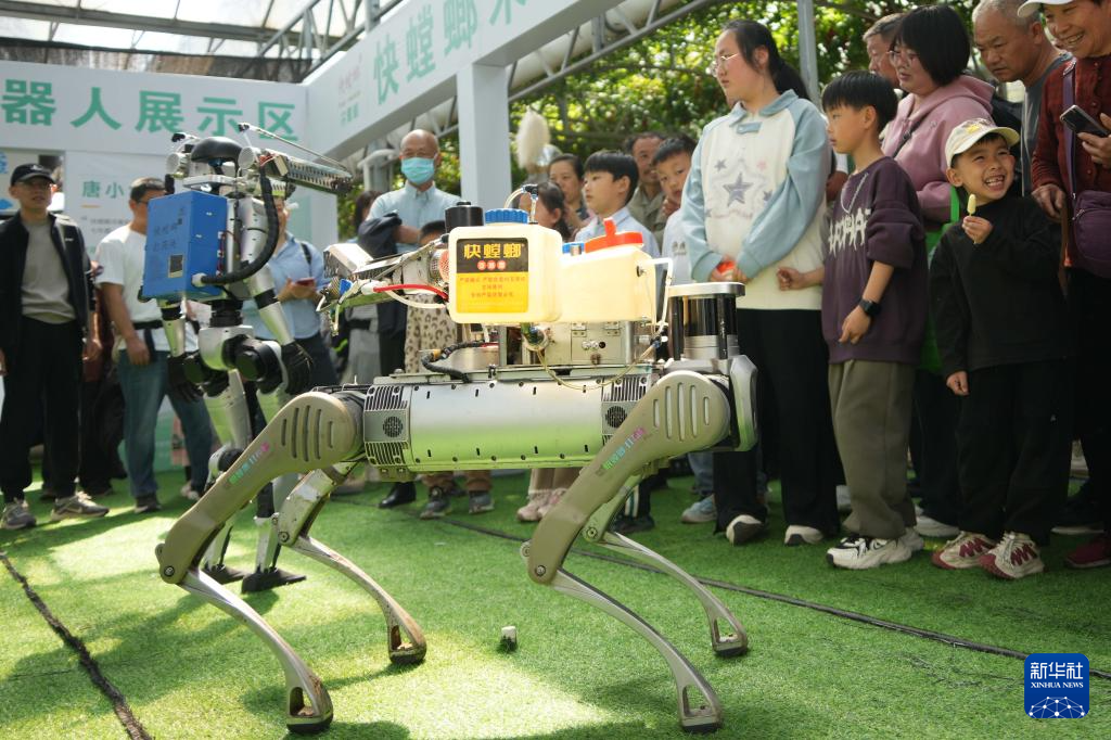 4月20日,在第二十六届中国(寿光)国际蔬菜科技博览会上,人们在观看农业机器人展示。