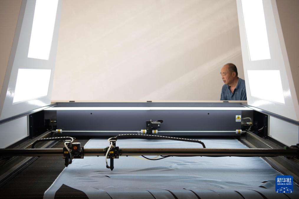 4月16日,在六安市裕安区丁集镇的一家门店内,工作人员使用电子设备裁剪婚服辅料。