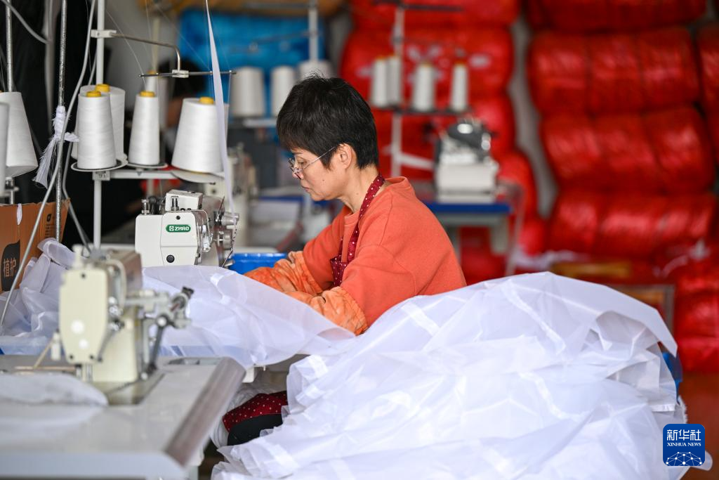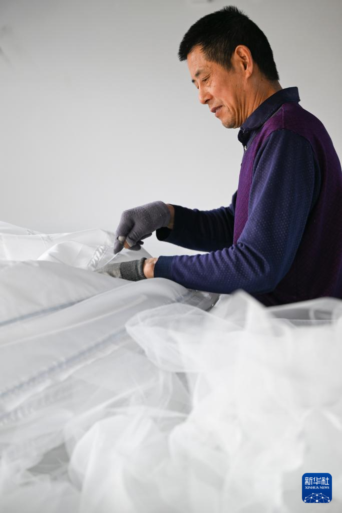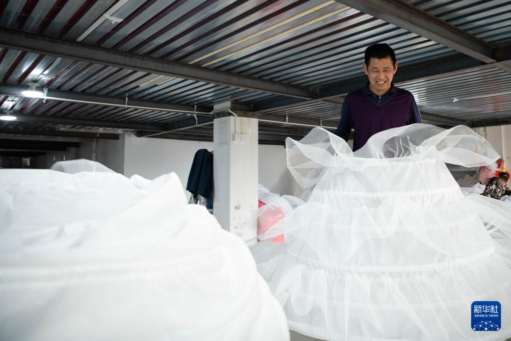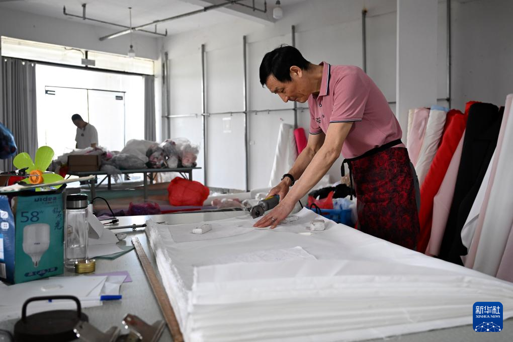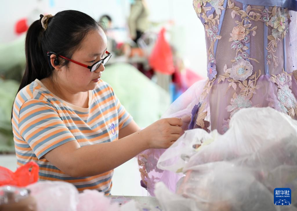 4月16日,工作人员在六安市裕安区丁集镇的一家婚纱生产企业制作婚纱裙摆。