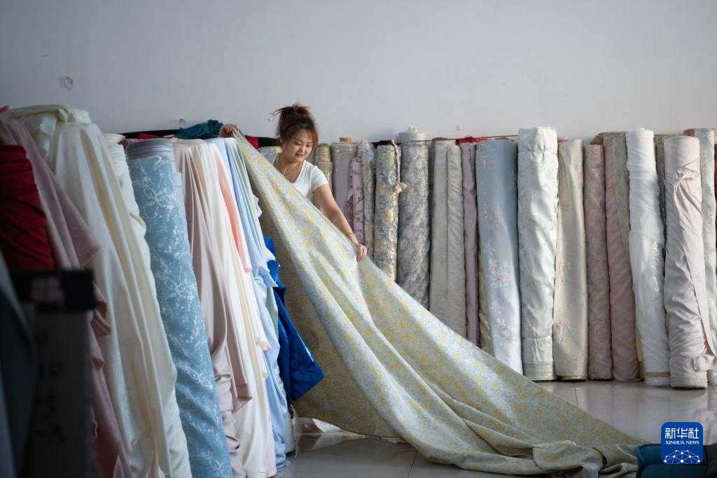 4月16日,在六安市裕安区丁集镇的一家门店内,商户李丹丹在整理服装布料。