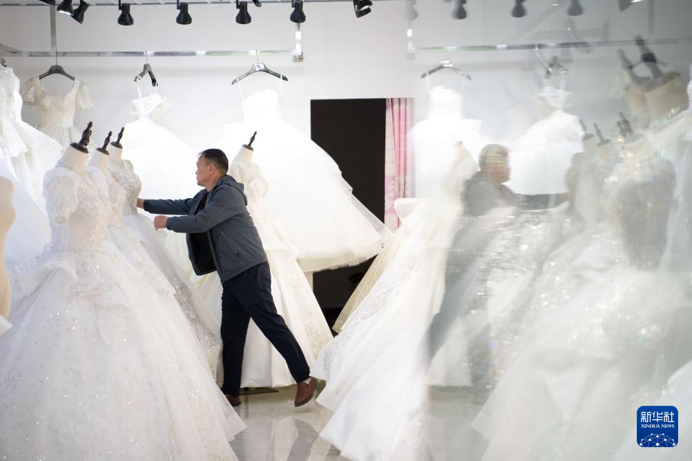 4月15日,在六安市裕安区丁集镇的一家门店内,工作人员在整理结婚礼服。