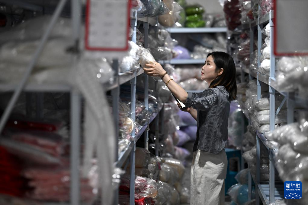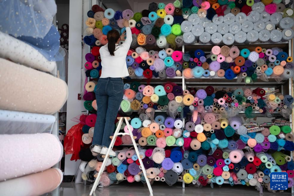4月16日,在六安市裕安区丁集镇的一家门店内,工作人员在整理服装辅料。