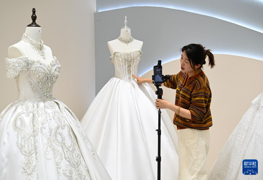 4月15日,在六安市裕安区丁集镇的一家婚纱店,工作人员通过直播销售婚纱。