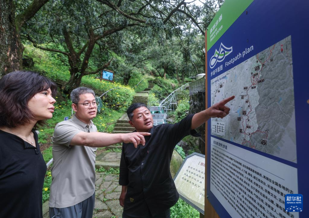 4月22日,来自浙江农林大学暨阳学院的驻点文化特派员童小军(中)与赵家镇宣家山村村干部(右一)在探讨香榧林旅游步道的线路走向。