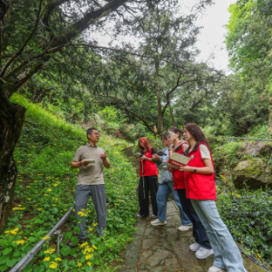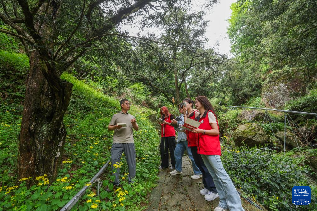 4月22日,来自浙江农林大学暨阳学院的驻点文化特派员童小军(左一)带领学生在诸暨市赵家镇宣家山村的古香榧林中实地走访,为特色农文旅发展提供调研报告。