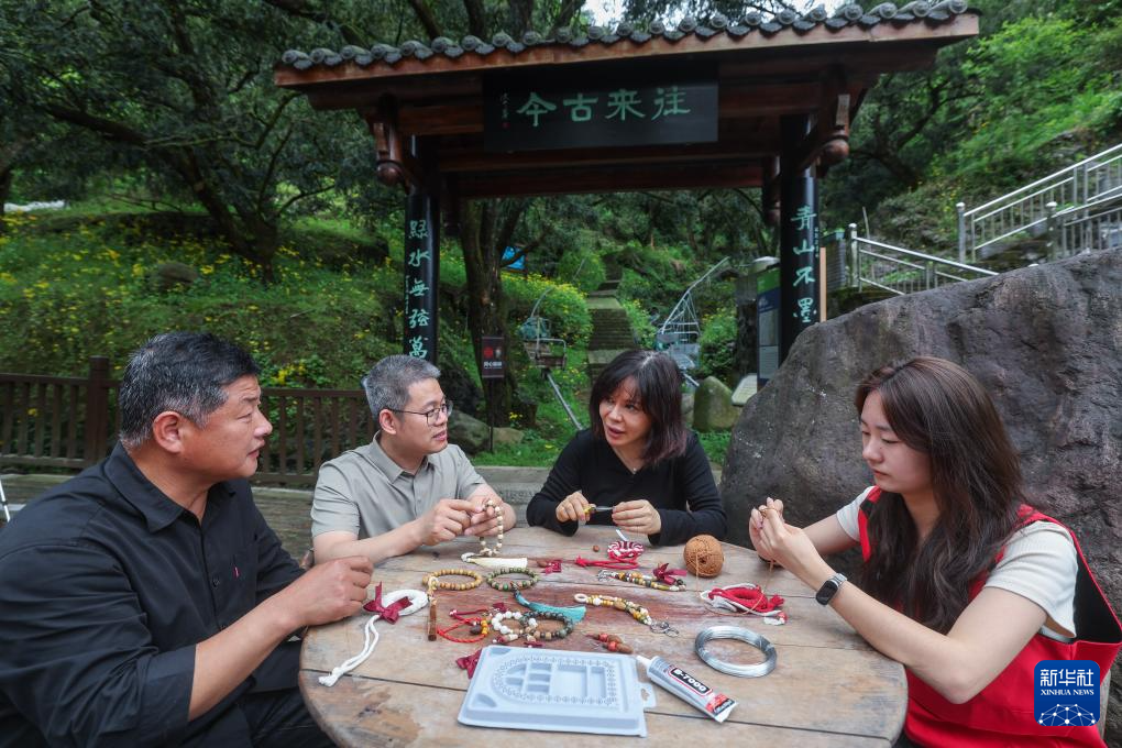 4月22日,来自浙江农林大学暨阳学院的驻点文化特派员童小军(左二)带着学生(右一)与当地镇、村干部一起探讨香榧特色旅游纪念品。