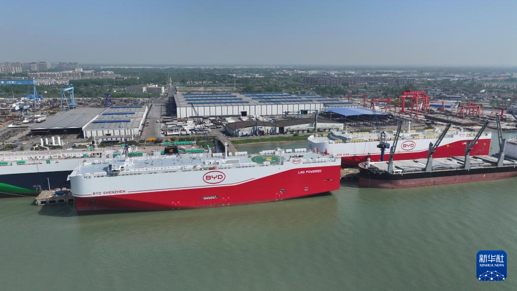 这是4月22日拍摄的停靠在江苏仪征金陵船厂码头的汽车运输船“深圳号”(图左,无人机照片)。